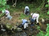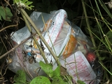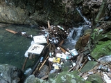 1時間半ほどで二人が帰り、6名となった。外は暑いが川の中は涼しい。深いところもあり、川の中4名体制が3名となった。まだ予定範囲の4分の1ほどしか進んでいない。やたら衣類が多い。じゅうたんや毛布もある。水を含み重い。地デジ化によるものなのかテレビの投棄がやはりあった。鉄骨、冷蔵庫、電気工事で出たごみ、ペットボトル、ビン、カン。新品の海水パンツもあった。値札や器具がついたままだ。おそらく万引きしたものではないか。そんなものが2つ。別の場所では値札がかたまって落ちていたので、万引きして何点かはそこで着用したのだろう。今回は紙おむつ(パット)がたくさん落ちていた。それが入った袋にカビキラーのスプレーが入っていた。綺麗好きなんだろうな。だのになんでよそに捨てるネン。